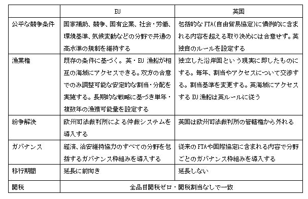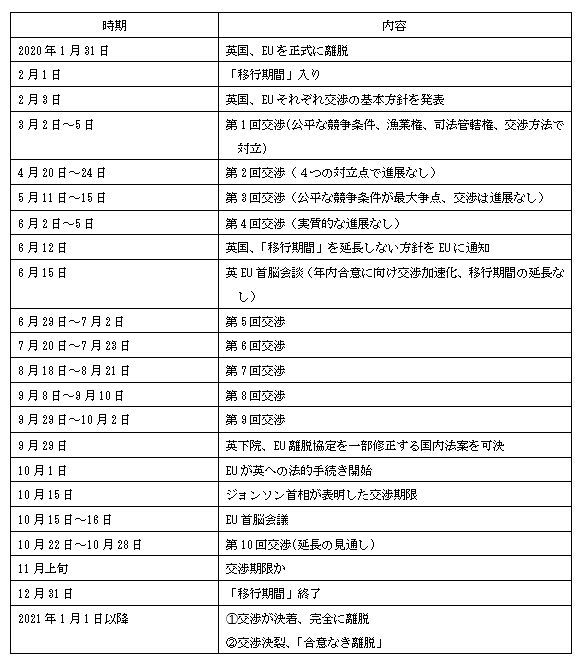 (出所)ジェトロ「英国のEU離脱後の英EU将来協定交渉の争点と進捗状況」(2020/10/13)などから作成。