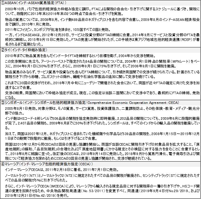 1.ASEANに接近したインド2005年の第1回東アジアサミット前後から、日本を含む東アジア・東南アジア諸国では、ASEANを核として、バイ・マルチの双方でFTAや経済連携協定締結に向けた動きが加速していた。周辺諸国の通商政策の潮流はインドにも波及し、インドのFTA外交も急速な展開を見せた。インドが経済連携協定の交渉を進める相手国/地域は、ASEANや南アジアなどアジア域内諸国のほか、南米地域、南部アフリカ地域など多岐にわたっていた。 インドが周辺アジア諸国とのFTA交渉を急速に進め始めた背景には、東アジアで急速に進展する経済連携協議により、ASEANを軸とした経済圏が形成される動きに、乗り遅れまいとするインド政府の危機感があった。ASEANとのFTAが進展すれば、ASEAN経済圏にインドが組み込まれる形となり、双方にとって、これまで参入が難しかった市場への輸出機会が拡大することになる。 ASEANの中でインド市場開拓に熱心であった国は、シンガポールである。インドとのゲートウェイを標榜していたシンガポールは、2005年にインド‐シンガポール包括的経済協力協定(CECA)を締結し、外国企業(特に日本)に対してもシンガポールをインドとのビジネスのゲートウェイとすることを呼びかけていた。ただし、シンガポールがインドへの「投資」促進を求める際、主に念頭にあるのは製造業ではなくインフラへの投資であることが多かった。 タイとは、2010年までに物品貿易を含んだインド-タイFTAを締結するという目標を掲げていた。交渉は2004年から始まり、これに先立ってアーリーハーベストで指定された84品目の関税について、2004年1月1日時点の関税率(MFNレート)をベースに、2004年9月1日に50%引き下げ、さらに、2005年9月1日に75%引き下げ、そして2006年9月1日に関税を撤廃した。 ASEANとのFTAは、2003年10月にASEAN・インド包括的経済協力枠組協定に調印した。物品貿易については、2008年8月に、インド側489品目のネガティブリストを含む内容で合意し、2009年8月のインド-ASEAN経済相会合で調印し、2010年1月に発効(物品貿易協定:AITIGA)した。 また、インドとASEANは、2012年12月20日に、サービスと投資分野のFTAの締結に合意している。2015年9月15日にサービスと投資分野のFTAが発効した。FTAの見直しが開始されたが、この手続きは東アジア地域包括的経済連携(RCEP)が署名されるまで延期となった。