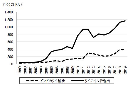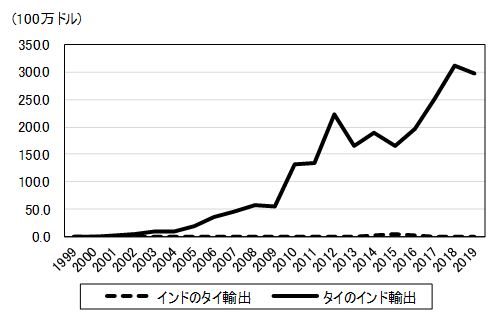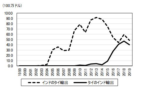図2は、ギアボックスのインドのタイ輸出、タイのインド輸出の推移を見たものである。インドのタイ向けギアボックス輸出は、2004年から始まり2013年まで拡大基調にあった。しかし、2013年をピークに減少し始め、逆にタイからインド向けの輸出が拡大しはじめた。なお、2019年のインドの対ASEANギアボックス輸出は、タイが4,800万ドルとASEAN輸出の7割を占めている。一方、インドの対ASEANギアボックス輸入は、インドネシアが4,400万ドル、タイが4,100万ドルである。 EH82品目全体の貿易の推移は、タイからインドの輸出とインドのタイ輸出を比べるとタイのインド輸出が拡大している一方で、インドのタイ輸出は伸び悩んでいる(図3)。しかし、タイのインド輸出にもいくつかの課題があった。 第1に、FTAのメリットが輸出インセンティブにつながらなかったことである。タイとのEH品目には、エアコンや冷蔵庫、テレビのブラウン管などの家電製品・部品も多く含まれる。家電分野では、タイ側に高品質な裾野産業の基盤があり、コスト面でもカラーテレビなどの家電製品は、インド製品よりもタイ製品のほう価格面で、割安とされていた。しかし、インド市場における輸送コストやリードタイムなどを考慮すれば、FTAによってタイからの完成品輸入が急増することはないというのが、当初の見方であった。 第2は、白物家電やテレビのインド市場では、韓国メーカーブランドが優位に立ち市場占有率が高く、タイを拠点とする日系企業の輸出の拡大にも限界があったことである。 第3は、インド市場よりは中国市場が優先されたことであった。82品目に含まれていたポリカーボネートは、インドの一般関税率が15%のところを6.25%の特恵関税で輸出し、メリットを受けていたが、中国向けの需要が大きく、インドからの引き合いは多いものの、生産キャパシティーが一杯のため、インド向けの輸出余力がなかった。