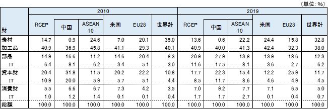 輸入では2019年のインドの対ASEAN輸入財別構成比は、加工品が41.3%、素材が22.2%、資本財が15.4%、部品が13.8%、消費財が7.7%である。加工品ではインドネシア、マレーシアからのパーム油輸入が大きな比率を占めている。素材は原油が大きい。資本財、部品ではIT関連製品の比率が高まっている(表4)。対中国輸入は、加工品、部品、資本財で約9割を占めている。また、IT関連製品の輸入比率が大きく、インドの対中輸入の3割を占めている。インドの対中輸入が拡大した要因は、IT関連製品の急拡大にある。 インドのIT関連製品の輸入に占める中国の比率は、2019年に部品(電子部品など)で39.8%、資本財(携帯電話、PCなど)で36.7%、消費財(映像機器など)33.1%といずれも高い。対ASEANのIT関連製品の輸入比率は、部品が15.4%、資本財が22.5%、消費財が42.2%と消費財で中国を上回っている。