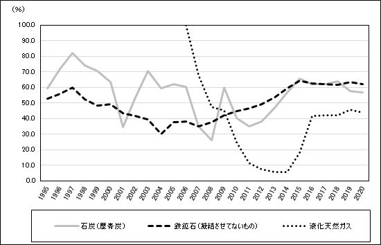 図2 中国の石炭・鉄鉱石・液化天然ガス輸入に占める豪州のシェア推移