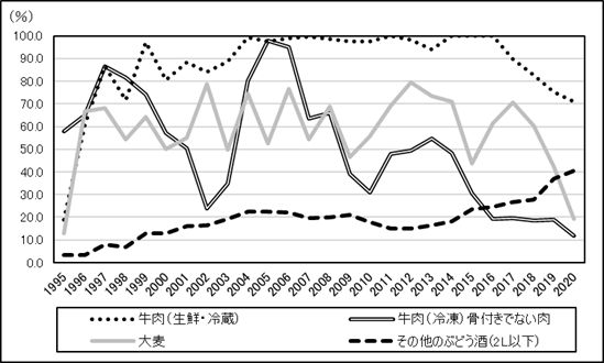 注:牛肉-生鮮・冷蔵(HS0201)、牛肉-冷凍(HS0202.30)、大麦(HS1003)、ワイン(HS2204.21)