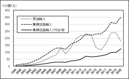 TSMCとメディアテック2020年の世界のスマートフォンの出荷台数は、前年比5.9%減の12億9,220万台(IDC調べ)、このうち、中国スマートフォン大手の華為技術(ファーウェイ)の出荷台数が同21%減と大幅に落ち込み、世界シェアで前年の2位から3位に転落した。特に、2020年10~12月期には前年同期比で42%減と激減、9月半ばからスマートフォンの主要部品である半導体の調達を米政府から厳しく制限されたことが影響した。他方で、同じ中国のライバルメーカーが躍進している。4位の小米(シャオミ)、5位のvivo(ビボ)がともにシェアを伸ばした。 ファーウェイ、小米、vivoともに、スマートフォンの心臓部であるマイクロチップは台湾企業に依存している。 ファーウェイは、端末と次世代通信システム「5G」向け基地局の双方に使用されている最先端のマイクロチップを、世界最大の半導体受託生産企業である台湾積体電路製造(以下TSMC)に製造を委託していた。マイクロチップの設計は、傘下のハイシリコンで独自に行っていたが、製造はTSMCであった。TSMCの売上高の約15~20%がファーウェイ向けであったという。米国の制裁により、TSMCはファーウェイからの受託生産を中止している。 小米、vivoの格安スマホのマイクロチップには、台湾のメディアテック(聯発科技)のマイクロチップが使われている。メディアテックは、2020年に5Gスマートフォン用マイクロチップ(SoC:システムオンチップ。CPUや通信モデムなどの基幹機能を1つのチップにまとめたもの)の販売量が4,500万個に達したと発表している。 メディアテックは、2000年代後半に中国市場で急増した山寨手機と呼ばれる格安携帯電話ブームの火付け役となった企業である。山寨機とは、メーカーが政府の認可を得ず、勝手に開発・販売した携帯電話のことで、品質面でも粗悪なものが少なくなかったが、有名ブランドの模倣品を正規メーカーの製品よりも非常に安価で販売したことで人気があった。 山寨手機は、メディアテック製のチップセットを用いれば、パソコンのようにパーツを組み合わせるだけで携帯電話を開発できたため、技術力をそれほど持ち合わせていない企業でも容易に参入できた。しかし、新規参入の乱立で類似した製品が増え、製品の差別化は「価格だけ」という状況になり、一時的なブームとして終わった。今回は、メディアテックはスマートフォ向けチップで再び旋風を巻き起こしている。 台湾に依存する中国の半導体輸入中国は、スマートフォンに限らず情報機器の心臓部であるマイクロチップの調達を台湾企業などの外国企業に依存している。中国は、は世界最大の情報機器輸出国であるが、マイクロチップ等の半導体輸入額でも世界最大である。 中国の半導体輸入額(以下はHS8542集積回路)は、2020年で3,520億ドル、前年比15.2%増と急増した。コロナ禍で情報機器の特需が発生したことが大きく影響している。2020年の中国の集積回路輸入額は、原油輸入額(1,760億ドル)の倍以上の規模となっている(図1)。 中国の集積回路輸入額は、1998年時点ですでに集積回路の輸入額が原油輸入額(HS2709)を上回っていた。ITバブルが崩壊した2000年に集積回路輸入が落ち込んで原油輸入額を下回ったが、その後リーマンショック後の2011年まで、一貫として集積回路輸入額が原油輸入額を上回っていた。 原油価格が大幅に下落し始めた2015年から半導体輸入額と原油輸入額の格差が広がった。中国にとって集積回路は、原油に匹敵する重要物資であったが、脱炭素を推進する中国にとって、今や、戦略物資は原油ではなく集積回路である。