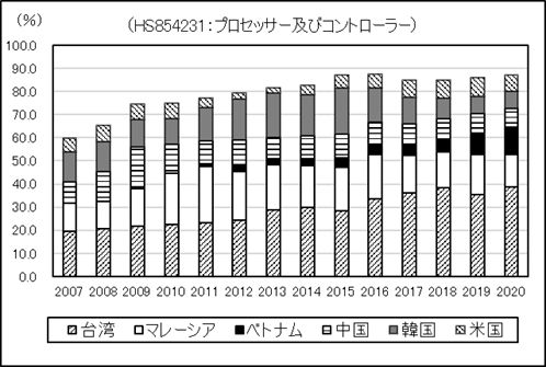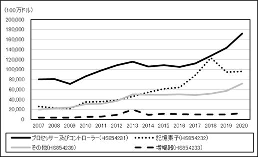 図2は、中国の集積回路の輸入を、HS番号6桁品目で分類したものである。HS番号6桁品目では、プロッセサー・コントローラー(HS854231)、記憶素子(HS854232)、増幅器(HS854233)、その他(HS854239)等に分類されている。この中で、プロセッサー・コントローラーの輸入(2020年で前年比19.7%増、1,718億ドル)が、ここ数年間で大きく拡大している。プロセッサー・コントローラーは、MPU(マイクロプロセッサー)、MCU(マイクロコントローラー)は、情報機器の機能を決定する最重要品である。 中国のプロセッサー・コントローラーの輸入先は、2020年で台湾が38.2%と約4割弱を占め、2位のマレーシアとの差を広げている。マレーシアを激しく追いあげているのがベトナムである。ベトナムは2009年から輸入が始まり、2020年には11.7%と1割を超えた。 記憶素子では、韓国が圧倒的な強さを見せている。2020年で、韓国と台湾を合わせて輸入額の8割を占めている。