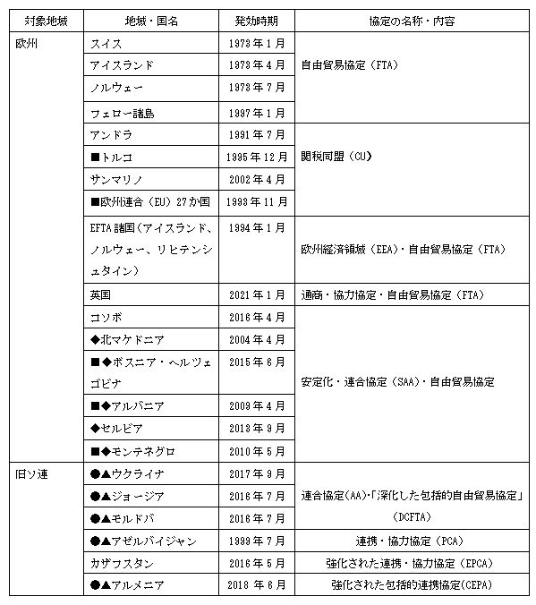 表1. EU・欧州諸国・地域とのFTA発効状況
