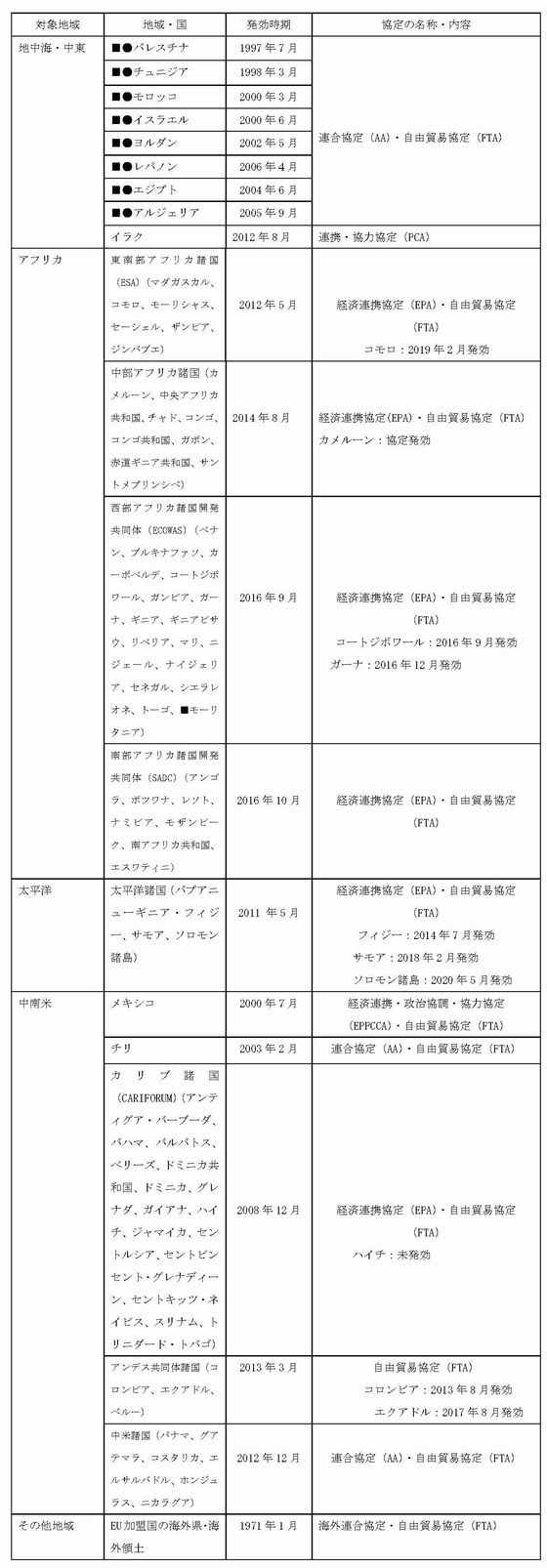 注8.EPA(Economic Partnership Agreement)は、EU加盟国の旧植民地・海外領土などを対象とする開発支援(貿易発展、持続的成長、貧困の縮小など)を柱とする包括的協定をさす。日本などが呼称する高度包括的FTAであるEPAと区別する必要がある。