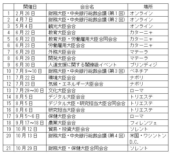 表. 2021年のG20閣僚会合の日程